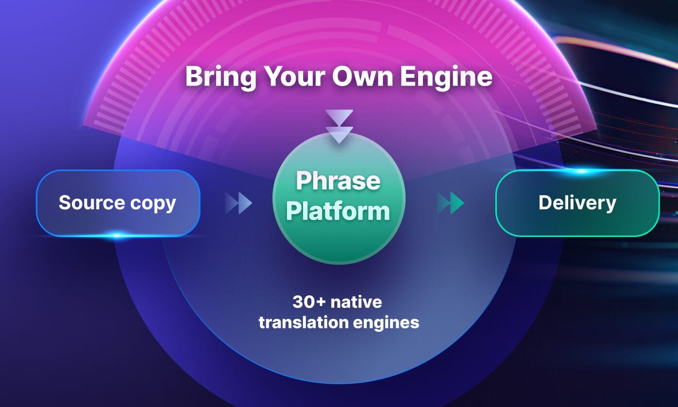 Con Bring Your Own Engine (BYOE) de Phrase, puedes hacer justamente eso. Nuestra capacidad BYOE te permite integrar directamente tus modelos propietarios en la plataforma y usarlos en tus flujos de trabajo de traducción personalizados. Ya dependas de una instancia privada por seguridad o quieras poner en funcionamiento un modelo especializado que hayas desarrollado, BYOE te da la libertad de llevar tus propias soluciones de MT a la potente plataforma de Phrase. Una vez integrada, tu solución de MT aparece como un perfil de MT dentro de Phrase Language AI y funciona como cualquier otro motor de MT.