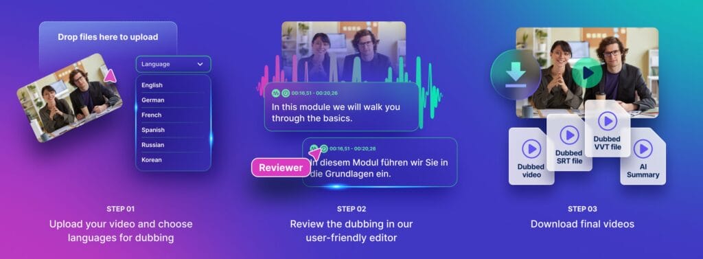 Combine the speed and scale of AI with expert human oversight, so you get fast, secure, and high-quality dubbing, every time.