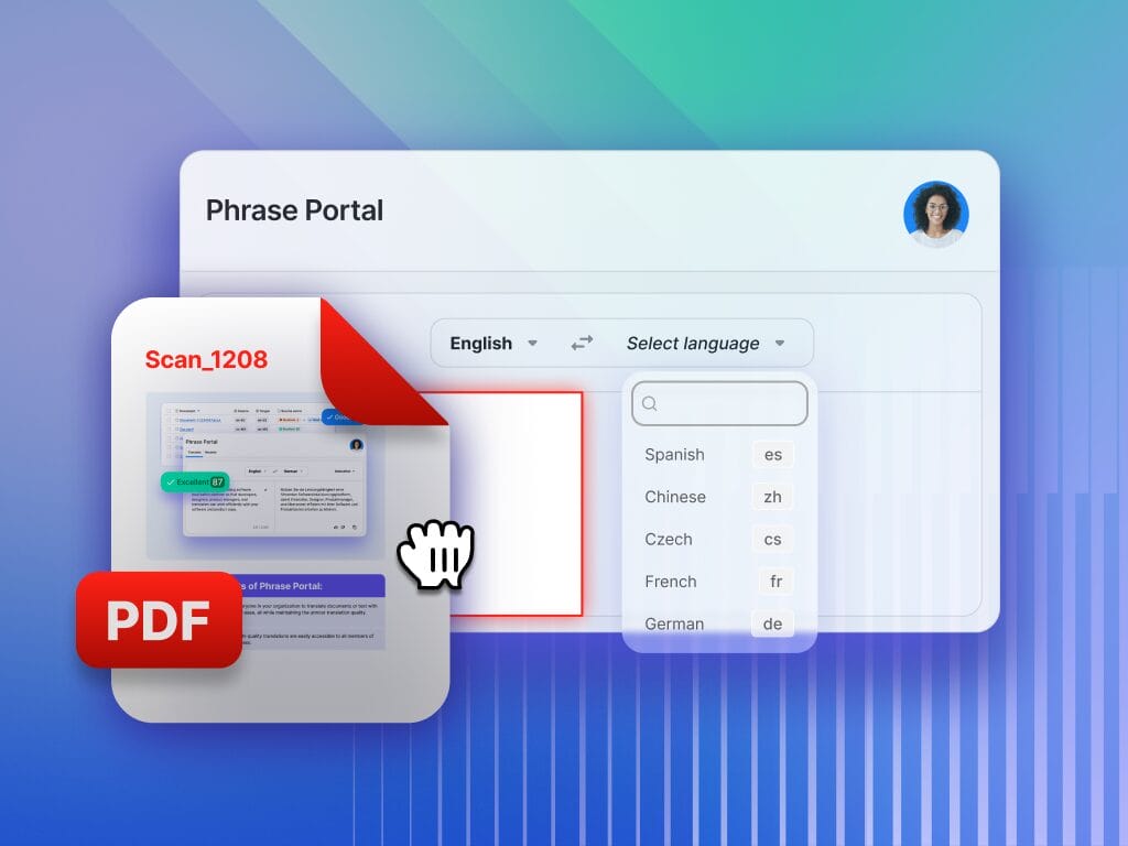 Give internal teams secure access to instant, high-quality MT. Phrase Portal makes it easy to translate common documents without slowing down your localization pipeline.